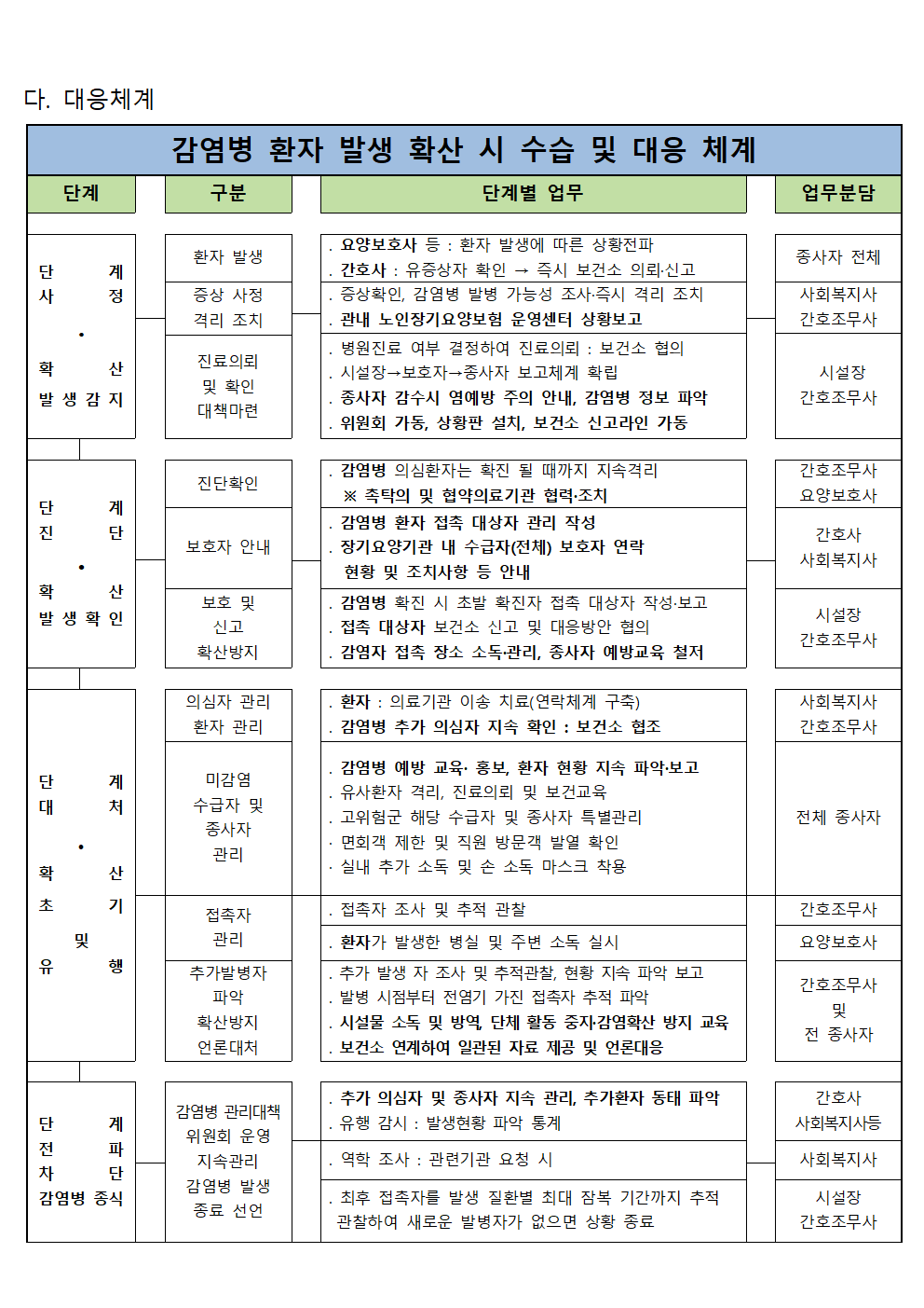 안녕하세요. 플러스행복한요양원입니다. 저희 요양원은 어르신들의 안전과 건강을 최우선으로 하여, 감염병 환자 발생 시 신속하고 체계적인 대응을 위해 아래와 같은 대응체계를 운영하고 있습니다. - 환자 발생 시 즉시 보건소에 신고 및 격리 조치 - 진단 확인 및 보호자 안내, 확산 방지 조치 시행 - 의심환자 및 접촉자 관리, 예방교육과 철저한 소독 실시 - 추가 환자 발생 시 확산 방지를 위한 단계별 대응 - 감염병 발생 상황 종료 시까지 지속적인 관리 본 요양원은 질병관리 지침에 따라 철저하게 대응하여, 어르신과 보호자님 모두 안심하실 수 있도록 최선을 다하겠습니다. 늘 건강하고 안전한 생활이 이어지길 기원합니다. 플러스행복한요양원 드림 |